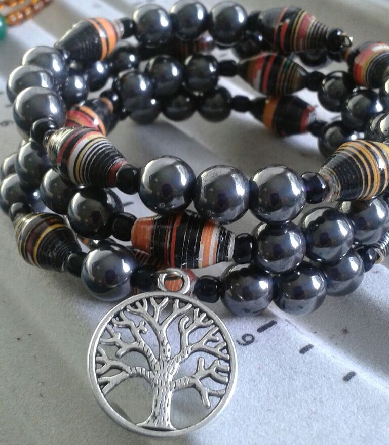 Coiled stacked bracelet designed with Zebra striped Uganda paper beads and Hematite gemstones, accented with black spacer beads