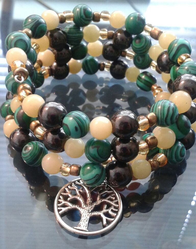 Coiled, stacked bracelet, designed with Onyx, Yellow Jade,Green Striped Agate, with bronze and gold spacer beads.