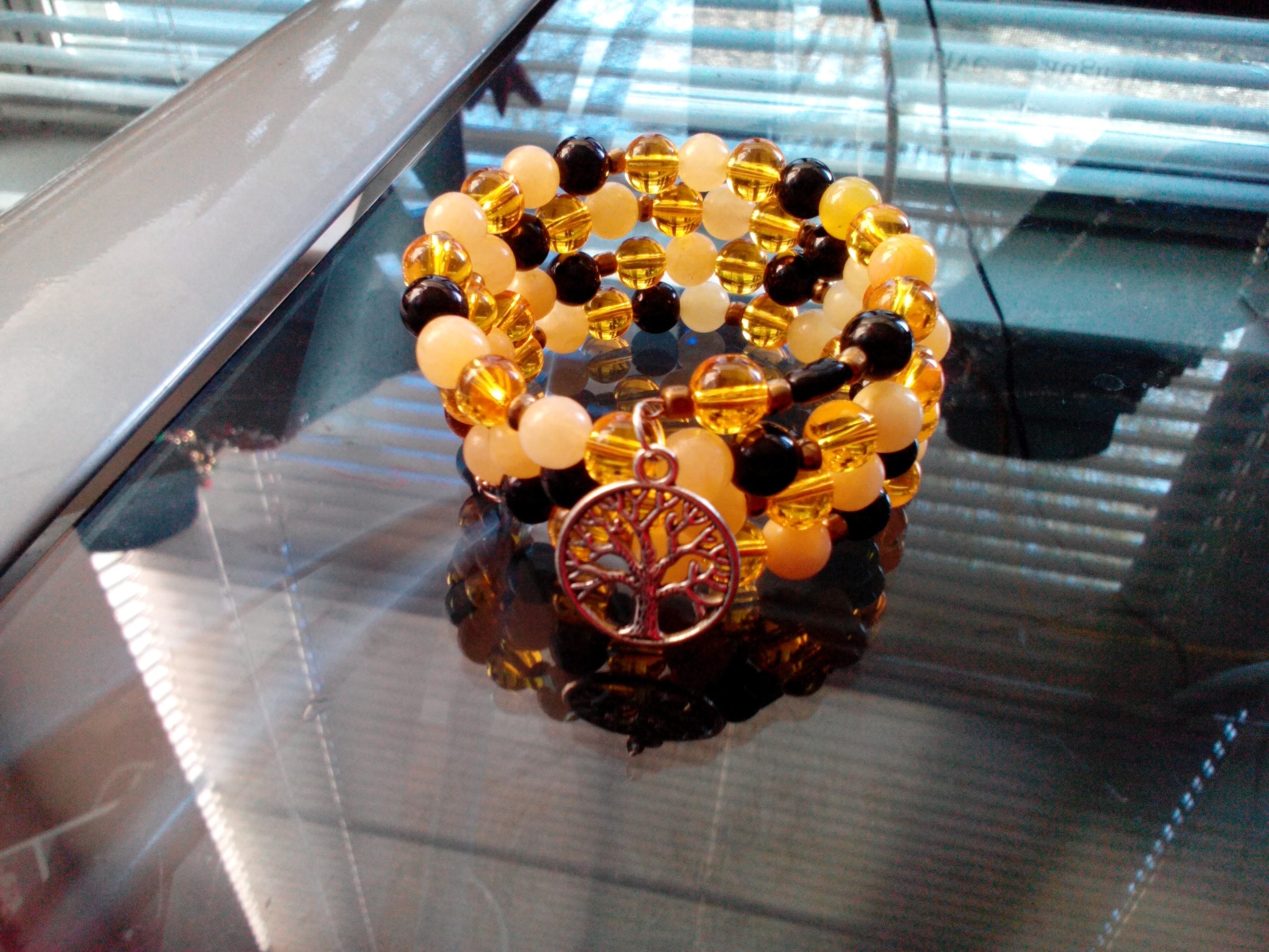Coiled stacked bracelet, designed with yellow jade gemstones and transparent yellow stones, accented with onyx.