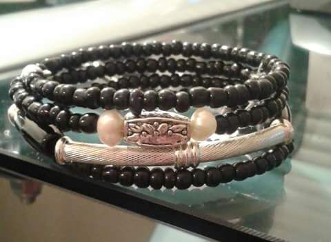 COILED STACKED bracelet, designed with silver spacer tubes surrounded by black accent spacer beads.