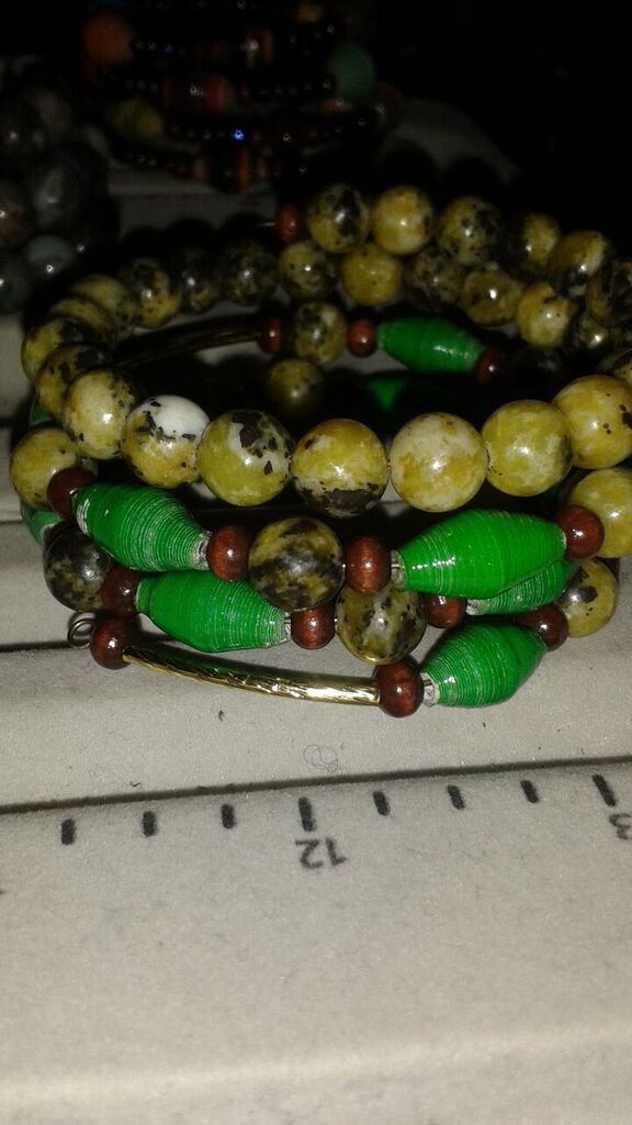 Coiled stacked bracelet, designed with Uganda Paper beads, yellow turquoise, with brown spacer beads.