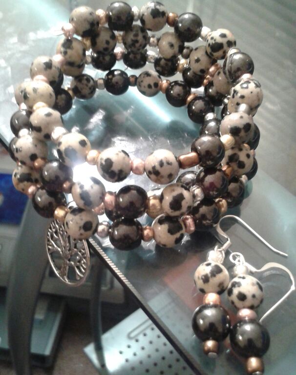 Designed from Dalmatian spot gemstones with gold accent beads,matching ristring $65.00