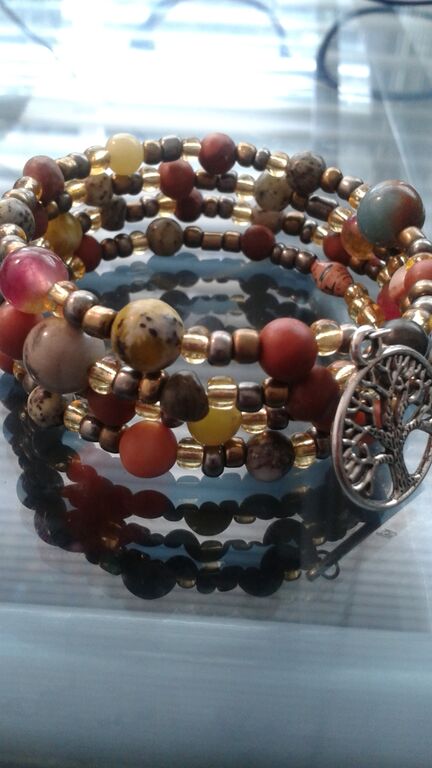 Designed from Picture Jasper, Red Agate, Yellow JADE,with assorted spacer beads, silver Hematite, gold,with Tree of Life accent charm.