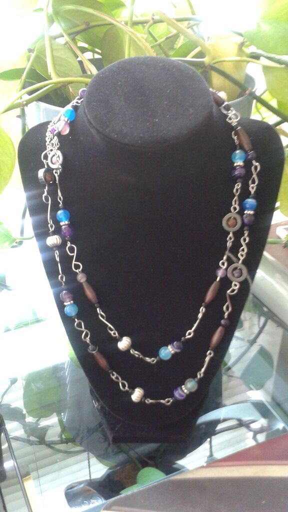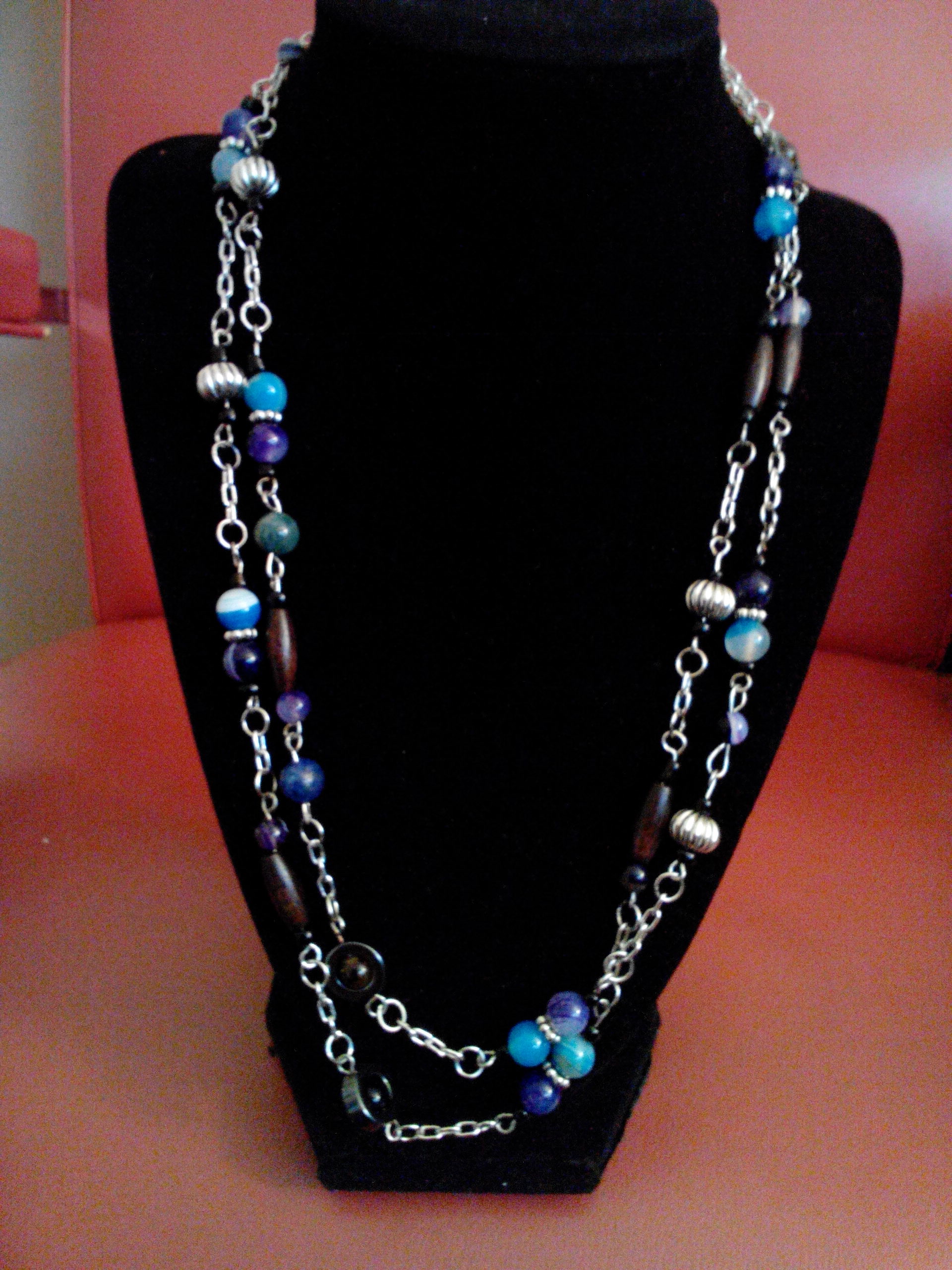 Chain link necklace, designed with Blue Striped Agate, brown wood spacer beads.