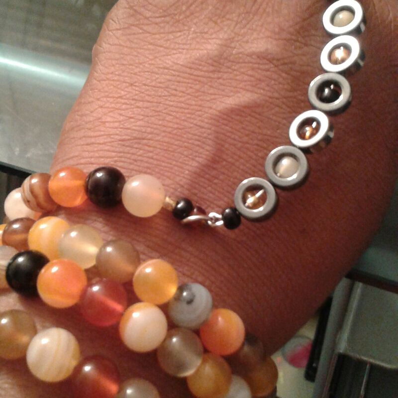 Designed with onyx, Carnelian, while fiber optic gemstones, accents of gunmetal rings and chain link.