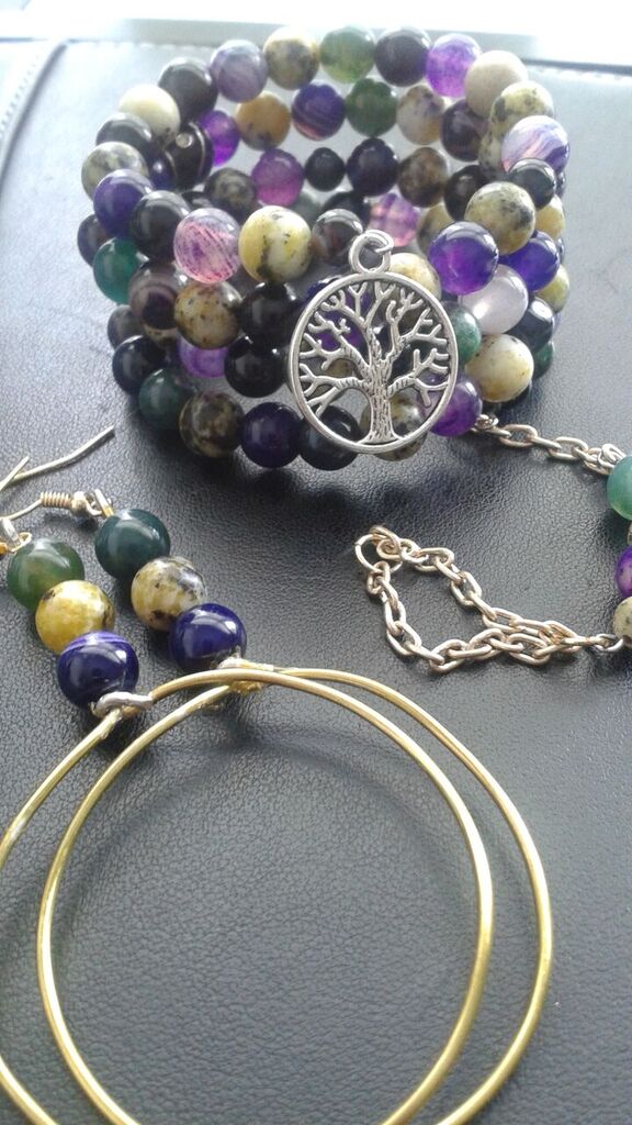 Designed with assorted colors gemstones with accents of gold-tone spacer beads with gold plated chain link. Matching hoop earrings $15.00