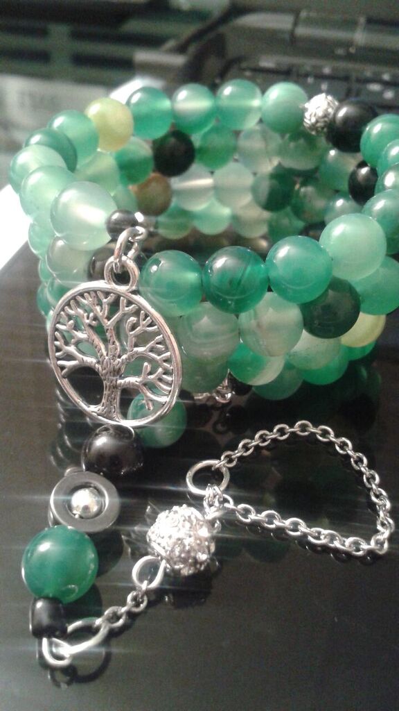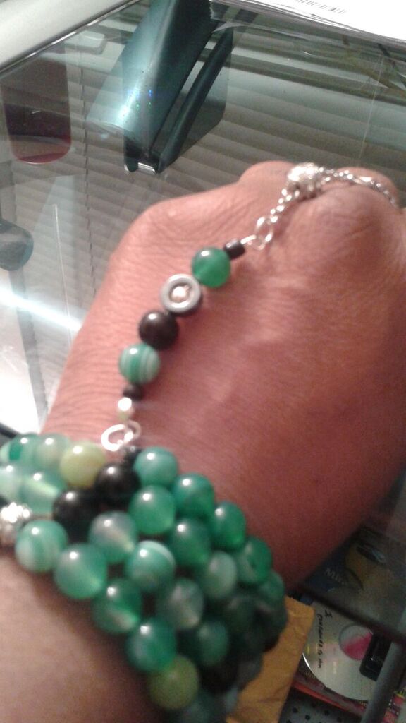Designed with green jade gemstones, with accents of black onyx and silver spacer plated chain link.