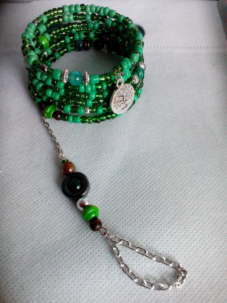 An array of glass seed beads accented with natural gemstones.